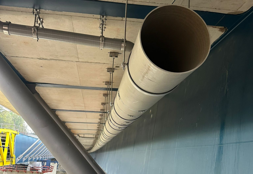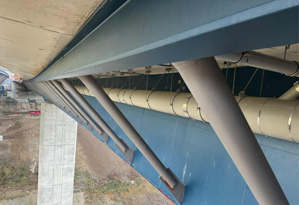 Herzstück der Arbeiten ist die Installation einer DN 600 GFK-Leitung, die mit einer besonderen Aussteifung gegen Wind versehen wurde. Diese Maßnahme ist notwendig, da die neue Brücke mit einer Höhe von 81 Metern besonderen statischen und klimatischen Belastungen ausgesetzt ist. Die Leitung sorgt dafür, dass Regenwasser sicher und kontrolliert von der Fahrbahn abgeleitet wird – ein entscheidender Faktor für die Sicherheit und Langlebigkeit der Brücke.